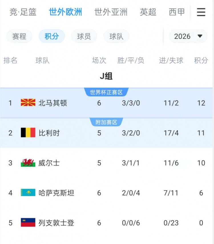 注:现在比利时队位列小组第二,但比北马其顿队少赛一场,比利时队下场将在客场对阵威尔士。