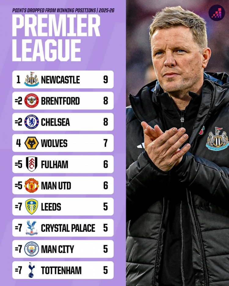 11月11日讯 Opta统计了本赛季英超球队跨越之后丢掉的积分,并排出榜单,纽卡9分最多,布伦特福德、切尔西8分次席。
