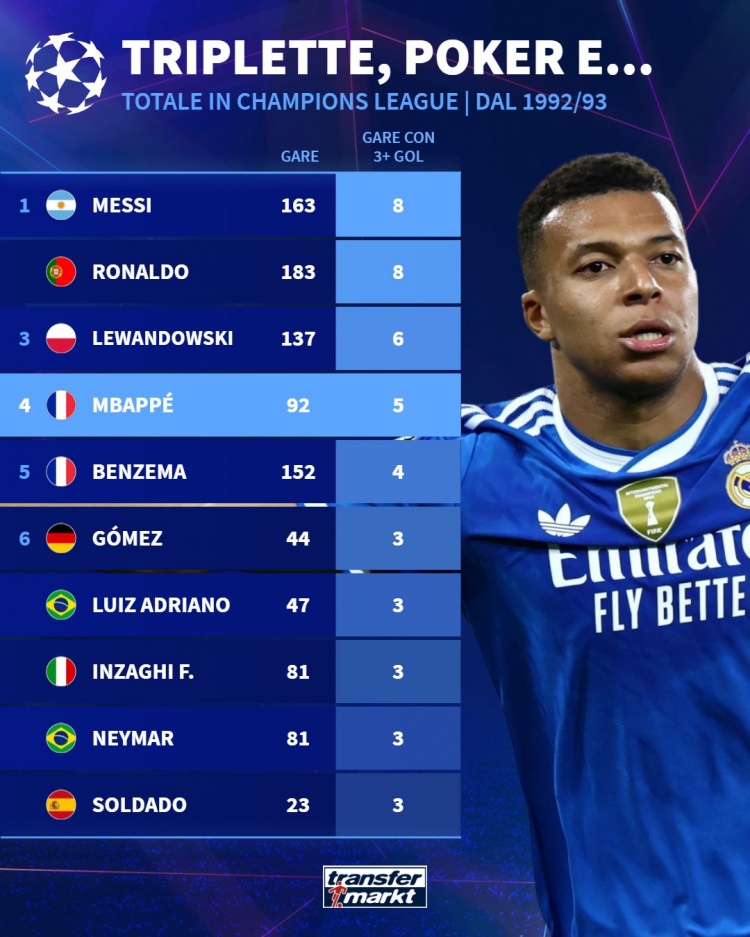11月27日讯 德国转会市集统计了1992-1993赛季欧冠改制以来球员单场进球3+的场次,比肩出榜单,梅西、C罗8场居首,莱万6场、姆巴佩5场。