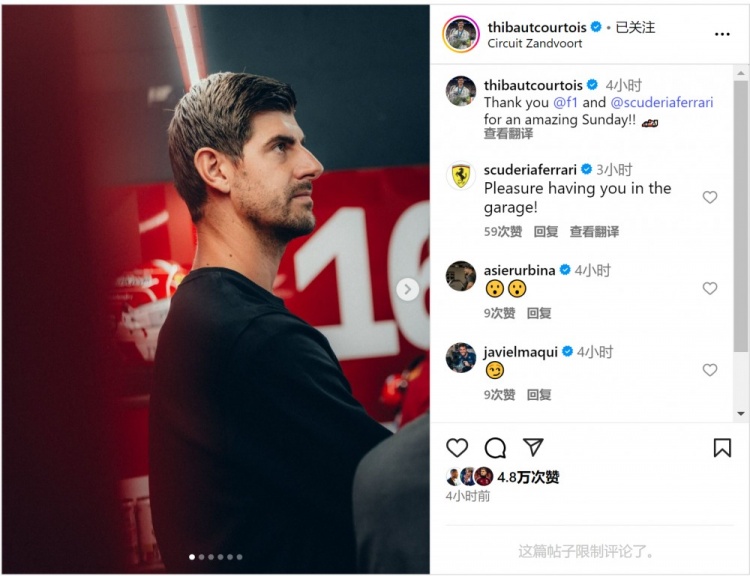 库尔图瓦受邀现场不雅看F1荷兰大奖赛,并窥伺法拉利车队,他在酬酢媒体上晒出相片,配文:“感谢F1和法拉利车队让我渡过一个奥妙的周日。”