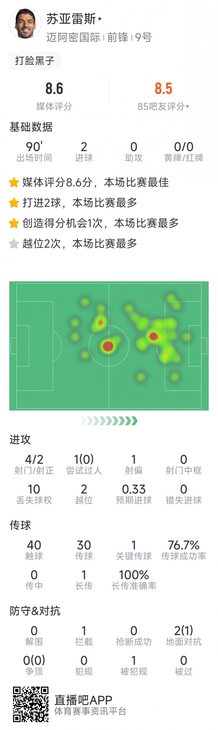 10月1日讯 在本轮好意思职联,迈阿密外洋3-5不敌芝加哥火焰。本场比赛苏亚雷斯梅开二度,以下为他在本场数据: