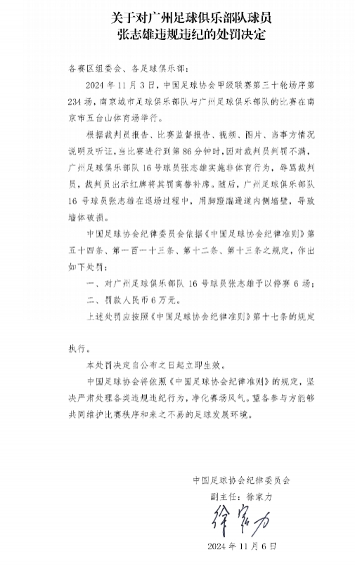 而在这个赛季的收官战中,张志雄再次引起事端。由于对判罚动怒,张志雄作念出黑白裁判的行径,并在退场经由中蹬踹通谈墙体,过后被中国足协贬责停赛6场并罚金6万元东谈主民币。