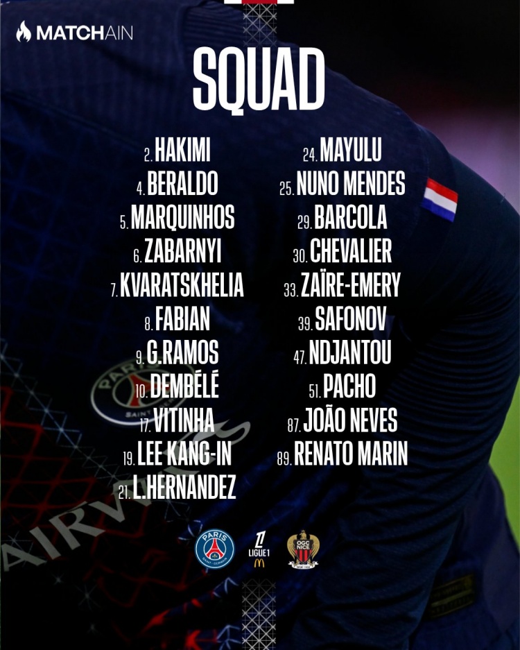 11月1日讯 北京时辰未来凌晨,巴黎将在法甲第11轮比赛中主场对阵尼斯,巴黎公布了此役的球员名单,阿什拉夫、李刚仁、法比安转头,杜埃、姆巴耶缺席。