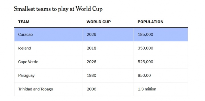 11月19日讯 2026年寰宇杯,佛得角和库拉索初度参预寰宇杯,他们的东谈主口数目也尽头少,据TA统计,库拉索及佛得角参预参加寰宇杯最少东谈主口排名前5,库拉索最少。