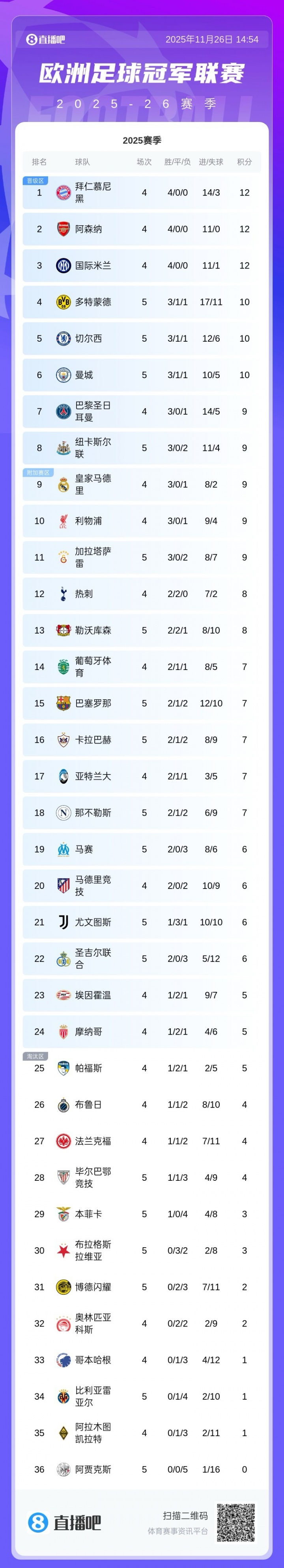 在现在的欧冠积分榜上,4支英超球队暂列前8晋级区,而西甲传统朱门“皇萨竞”则暂列晋级区除外,毕尔巴鄂、比利亚雷亚尔致使位列淘汰区。