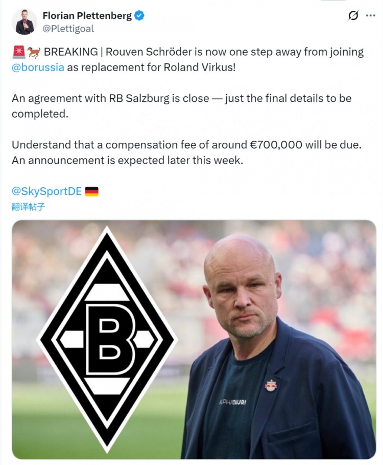 媒体指出,门兴有意遴聘萨尔茨堡总监施罗德,让其成为俱乐部的新任总监,以替代离任的维尔库斯,门兴接近与萨尔茨堡竣事契约,只剩终末细节有待敲定,赔偿金约为70万欧,预测本周晚些时辰官宣。