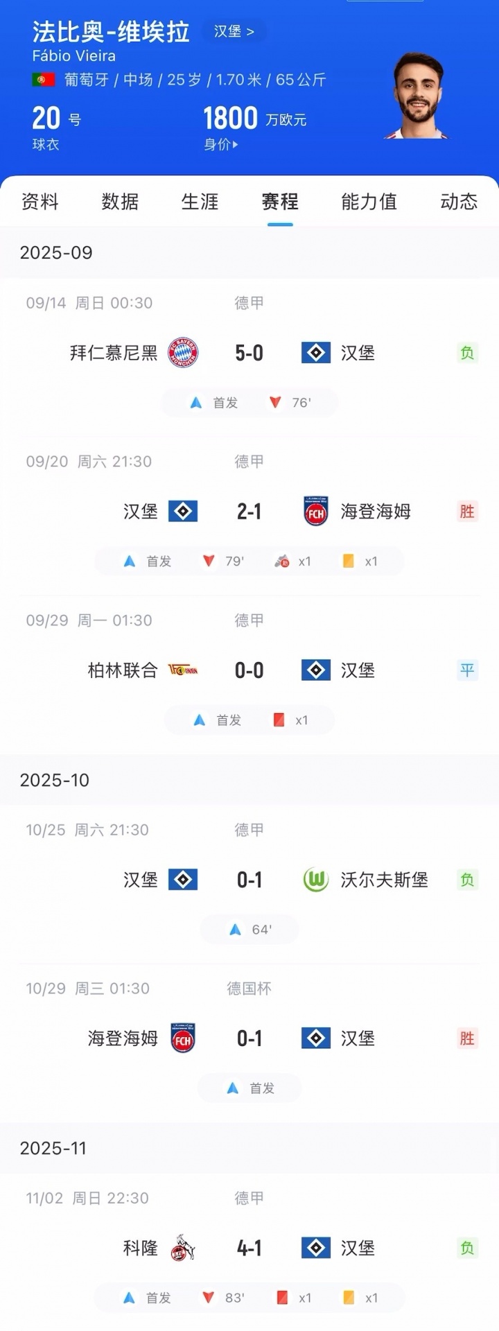 11月03日讯 德甲第9轮科隆4-1完胜汉堡,阿森纳租将法比奥-维埃拉再度染红,本赛季出战5轮德甲也曾拿到2张红牌,同时数据则为0球1助。