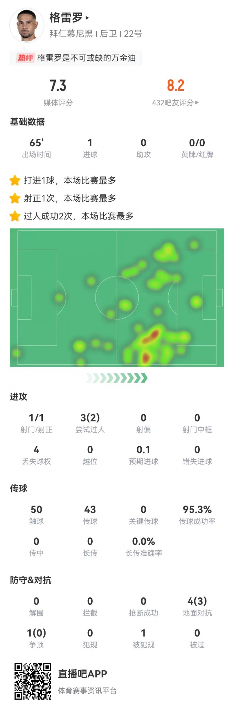 11月30日讯 拜仁在本轮德甲3-1逆转圣保利,格雷罗本场数据如下: