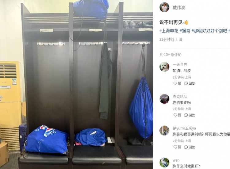 戴伟浚在社媒晒出了磨练浪漫后更衣室的像片,他在更衣室的座位碰巧紧挨着于汉超的位置,看着于汉超打包好的衣物,因此他超越咨嗟地配文“说不出邂逅”。