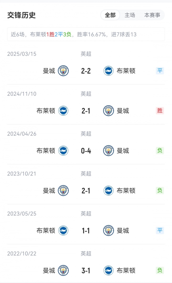 2017/18至2023/24赛季技能,布莱顿对阵曼城的14场联赛仅赢下两场(1胜1平12负)。