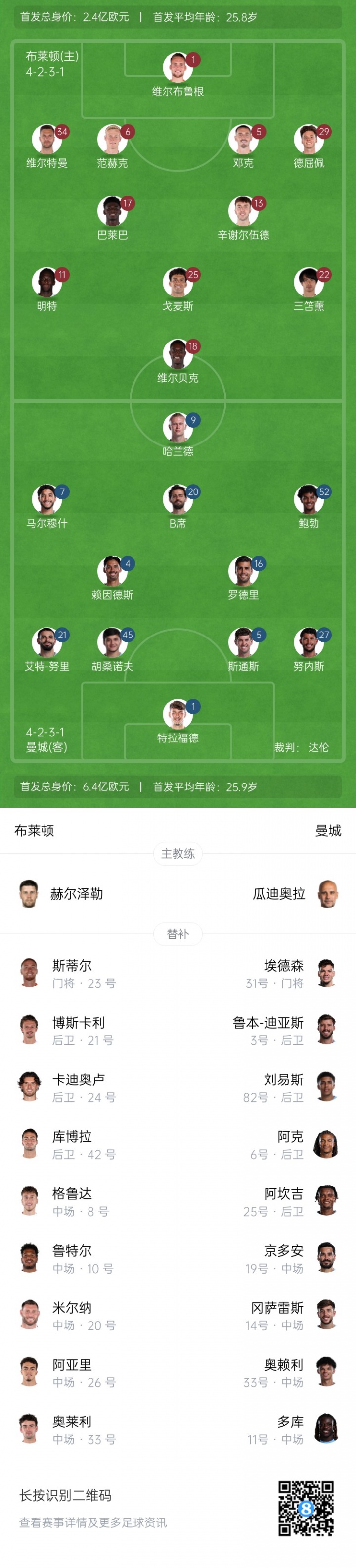 布莱顿首发:1-维尔布鲁根、5-邓克、6-范赫克、29-德库耶佩、34-维尔特曼、13-辛谢尔伍德、17-巴莱巴、25-迭戈-戈麦斯、11-明特、18-维尔贝克、22-三笘薰