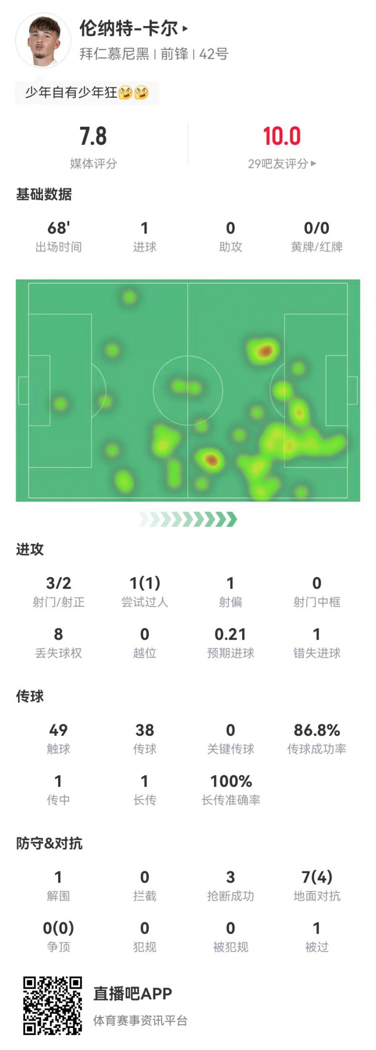 10月23日讯 拜仁在本轮欧冠3-0向上布鲁日,小将伦纳特-卡尔本场数据如下: