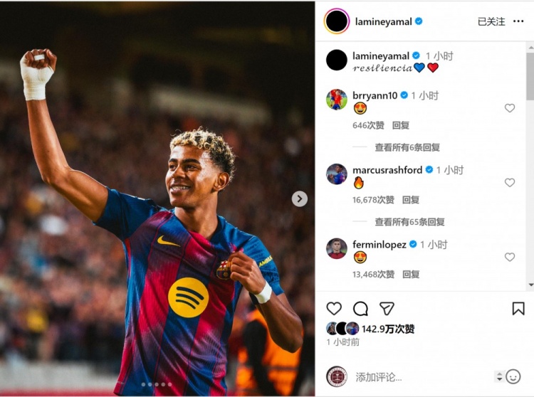 亚马尔赛后社媒晒照庆祝收效,配文:“执意。”