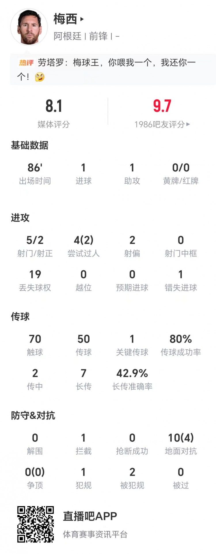 期间统计数据清晰,梅西本场比赛5射两正,打进1球并送出1次助攻,4次过东说念主两次胜利,1次要道传球,10次大地顽抗胜利4次,获评8.1分。