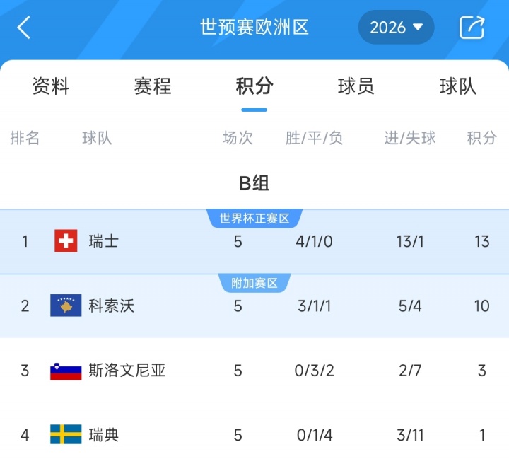 11月16日讯 世初赛欧洲区小组赛B组第5轮,斯洛文尼亚主场0-2负于科索沃,提前一轮细目无缘2026寰宇杯。
