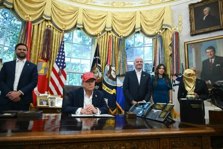 副总统JD-万斯(左一)、海外足联主席詹尼-因凡蒂诺(右二)及国土安一说念长克里斯蒂-诺姆(右一)共同见证这次公告。