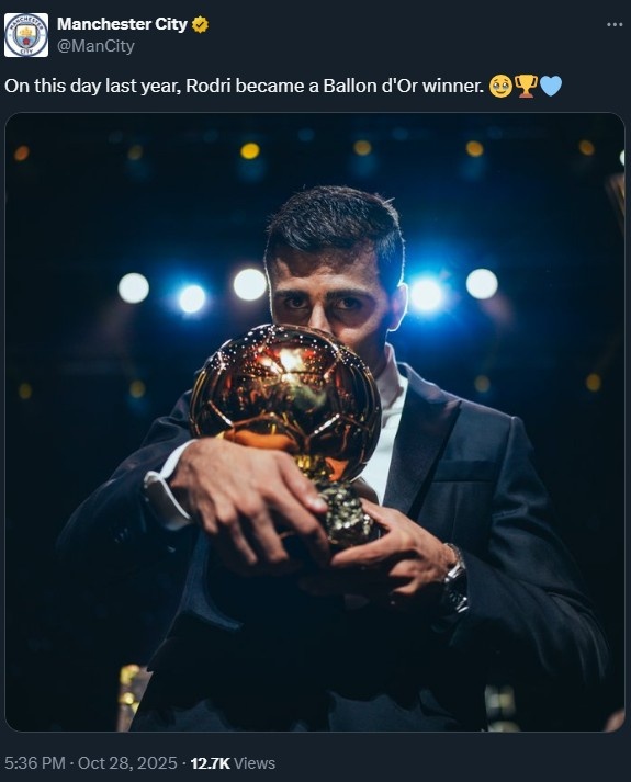 曼城晒出罗德里亲吻金球奖的像片,并写谈:“旧年本日,罗德里成为金球奖得主。”