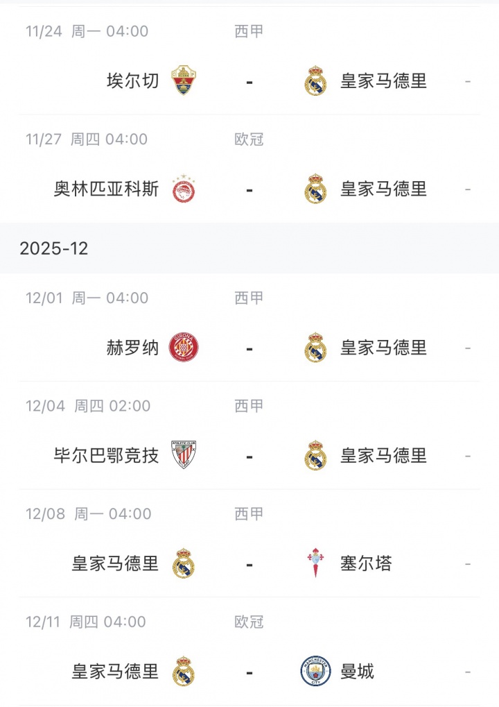 皇马将在海外比赛日规模后迎来连结四个客场,以及将迎来与曼城的欧冠比赛,记者Picon以为,这是对阿隆索的一次大考,他写谈:“连结三个客场征程,包括对阵本赛季黑马埃尔切与毕尔巴鄂竞技。而远处巨兽隐现:与曼城的对决,将成为历练这支球队是否具备抗衡欧洲顶级豪强实力的又一次大考——本赛季他们已两度失利。”