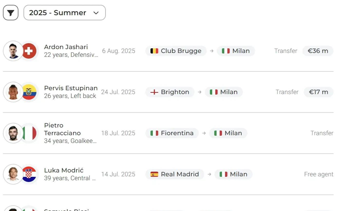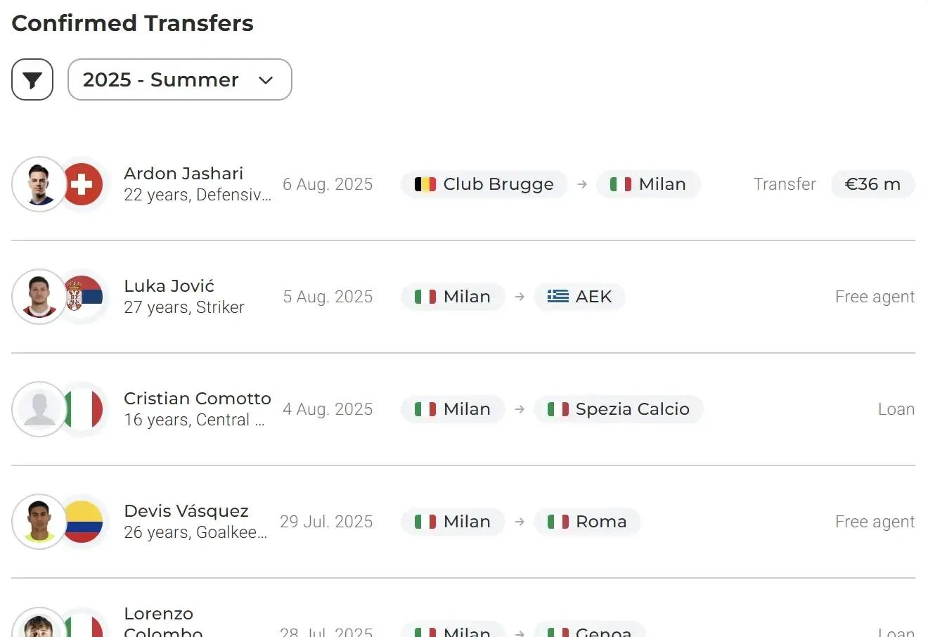 贾沙里 :这位23岁的详细/中场球员以3900万欧元从布鲁日转会而来,是米兰队史第9贵的引援。他拒绝了其他俱乐部更优胜的报价。这位瑞士球员同样从小便是米兰球迷,一张8岁的阿尔顿在圣西罗看台不雅看米兰对阵巴萨比赛的相片一经在流传,那恰是博阿滕打进惊世倒钩的经典之战。就场上特质而言,贾沙里是最接近奏凯替代赖因德斯的东谈主选。在初度新闻发布会上,阿莱格里书记他将使用三中场体系,接洽到福法纳、奇克、穆萨和邦多的存在,竞争将很热烈。