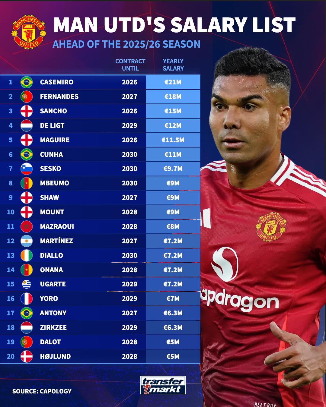 虎扑08月24日讯德国转会商场统计了曼联球员的年薪,以及契约到期本领,确信如下: