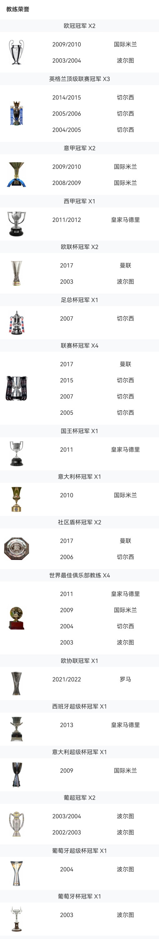 62岁的穆里尼奥最近一次率队夺冠仍是21/22赛季在罗马拿到的欧协联冠军。再往前追念,即是曼联时分16/17赛季拿到的“小三冠”。