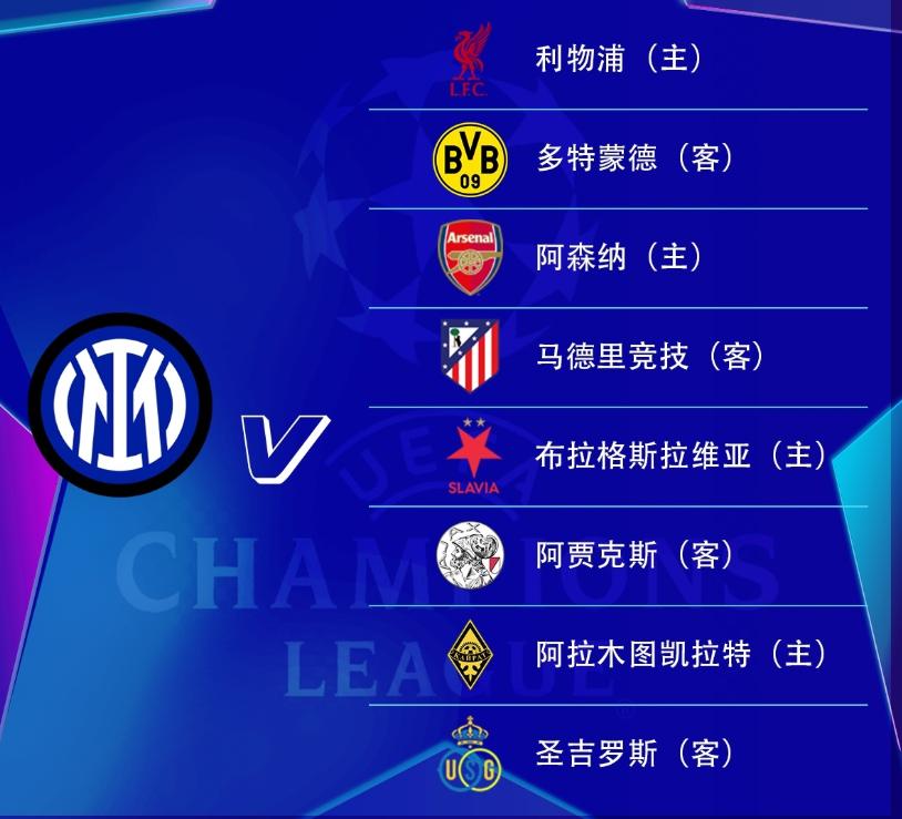 海外米兰敌手:利物浦(主)、多特蒙德(客)、阿森纳(主)、马德里竞技(客)、布拉格斯拉维亚(主)、阿贾克斯(客)、阿拉木图凯拉特(主)、圣吉罗斯(客)